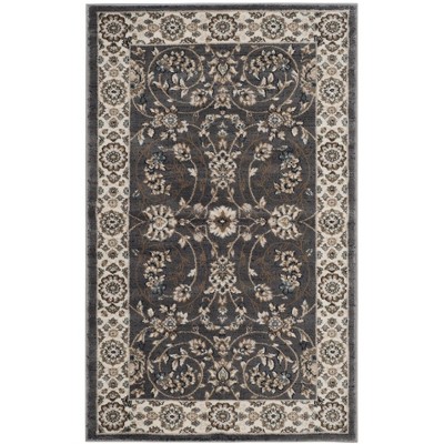 Elevate your living space with the timeless elegance of our Anthracite/Cream area rug, sized at a versatile 3'-3" X 5'-3". This small rectangular rug showcases a sophisticated pattern, featuring an intricate array of florals and traditional motifs set against a dark anthracite backdrop, elegantly bordered by a cream frame that highlights its classic design.