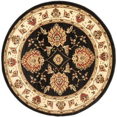 Introducing our exquisite 5'-3" X 5'-3" Round Area Rug, a perfect blend of elegance and durability for your living space. This luxurious rug features a rich palette of black and brown hues, with an intricate pattern that exudes a timeless charm. The design showcases a central black field adorned with delicate floral motifs, encircled by a sophisticated border in varying shades of beige, brown, and hints of red florals, adding warmth and texture to any room.