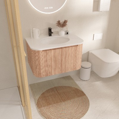 Lyngins Wall-Mounted Floating Bathroom Vanity with Sink & Soft-Close Drawer, Pre-Assembled Curved Edge Storage Bathroom Cabinet in Natural Walnut