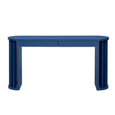 Lyngins Modern Oak Veneer Console Table with 2 Drawers, Floor-Length Fan-Legs, 59" L Farmhouse Oval Entryway Table, Sofa Tables Narrow Long, Navy Blue