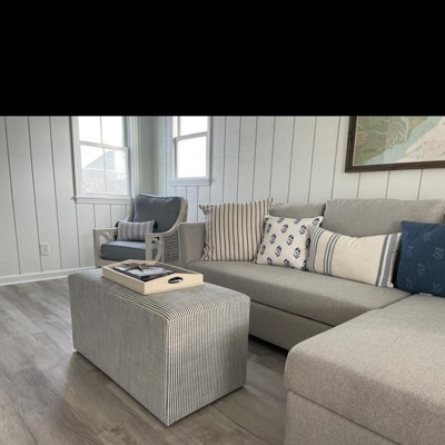 A: The cube bench features a contemporary, modern vibe with a crisp, clean striped pattern.