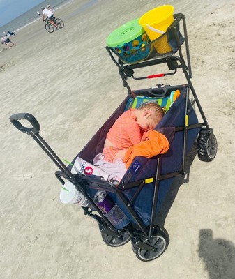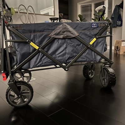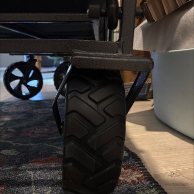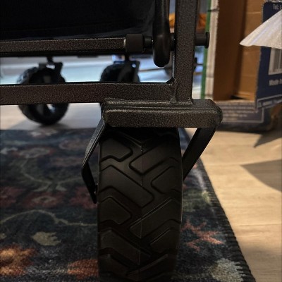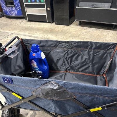 [This review was collected as part of a promotion.] This wagon has been great! We use it multiple times per week to haul our chairs, bags, etc. from our car and through the ballpark for little league games. We’ve also used it for my dogs to ride in when they get tired. The push handle with the basket has come in very handy and is a nice feature when pushing rather than pulling is more comfortable. The handle for pulling locks in place when not being used and also has a telescoping handle for adjustment and comfort. It steers very well using either the pull handle or push feature. The wagon itself is very sturdy and seems durable. The padding in the bottom is thicker than I expected and my kids say it is comfortable to sit in. It has nice deep sides to hold everything. It has two drink pockets on the front which is very nice. We’ve used it in grass, on pavement, and even through some mulched areas with no problem. It folds very nice and flat and fits in my small car trunk with no problem. The only downside we’ve found so far is that it does not have locking brakes on the wheels to prevent it from rolling away if you’re not holding on and it will not stand upright when folded without leaning against something. These are both minimal issues when compared to the quality and performance we’ve experienced.