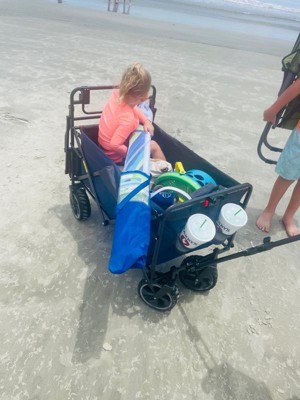 [This review was collected as part of a promotion.] WOW! This is probably the BEST wagon ever!! From the durability, to the storage.. it is incredible! It maneuvers sooo well even at max capacity! It’s super versatile and required literally no assembly!! All three of my tall kiddos fit in it and their puppy and it’s still simple to pull! It pulls super easy on the beach too even with a full cart. The only “complaint” is that when it’s folded it doesn’t stand up but that’s my husbands complaint. It doesn’t bother me! Definitely a win and I would for sure buy again!
