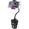 The Macally MCUPPOWER is an adjustable gooseneck car cup holder mount for iPod/iPhone/smartphone (with or without a protective case) between 1. 77and 4. 1 either long or wide. The Macally MCUPPOWER has a spring-loaded adjustable grip and one-touch release buttons to easily remove the iPod/iPhone/smartphone from the holder. The soft cushioning on the holder provides extra grip and protects your iPod/iPhone/smartphone from scratches. The Macally MCUPPOWER has an 8 super-long flexible neck and a 360-degree rotatable holder for the best viewing angle. The adjustable base of the Macally MCUPPOWER fits perfectly in the cup holder of most cars. As the name suggests, the MCUPPOWER has two USB ports (2 x 5V/2. 1A) to charge two mobile devices simultaneously, as well as two cigarette lighter sockets to charge other devices. The Macally MCUPPOWER is compatible with a 12-24V car power input.