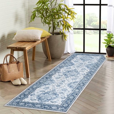 9x12 Washable Rug Non-Slip Backing Vintage Low-Pile Carpet Traditional Floral Indoor Floor Covering for Living Room Dining Room Bedroom Blue