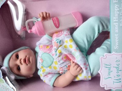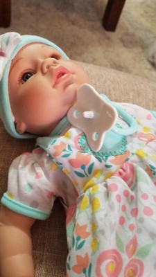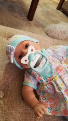 This baby is so cute, my daughter loves it! The pacifier and bottle do not fit in baby’s mouth, which frustrates my toddler but otherwise it’s a great doll.
