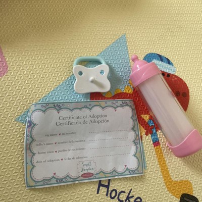 My baby loves her doll. This is our second time buying it. It came with a baby bottle, a pacifier, and a cute certificate of adoption.