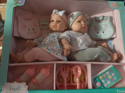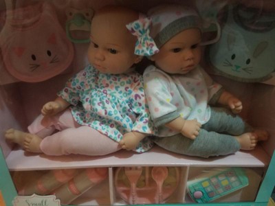 The cutest twins dolls, I have ever seen. You get a boy and a girl. Super cute outfits, the baby girl comes dress in pink with pink pants and a pink headband and a baby bottle. The boy comes dress in grey and blue with a beanie. Super cute eyes. They are so adorable!