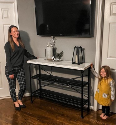 [This review was collected as part of a promotion.] Warning, it’s huge! But it’s so beautifully made that it’s worth the size and the price. I should have measured first. The table is constructed well, sturdy, and should last for a long time, even with my rough and tumble kids throwing shoes on the shelf. The style is classic and matches my decor nicely. I do keep a runner on the table portion though to prevent scratches