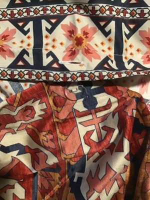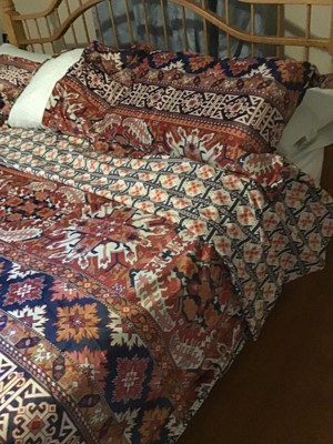 [This review was collected as part of a promotion.] Nothing unassuming here, this cover really changed the overall look and feel of my master bedroom. One side has a bright southwest pattern, and adds a lot of color to a otherwise drab bedroom. We have a lot of light wood and we needed a real focal point, this is definitely it. One side of the cover has a velvety feel, the other side feels like a higher thread count sheet, it’s a 100% polyester cover in actuality. I machine wash in cold water and tumble dry on low to avoid wrinkling. One one issue was the buttons, they were not sewn on as well as I think they should be. Overall, I think this is a great cover with nice overhang and the pillow covers were generously sized.