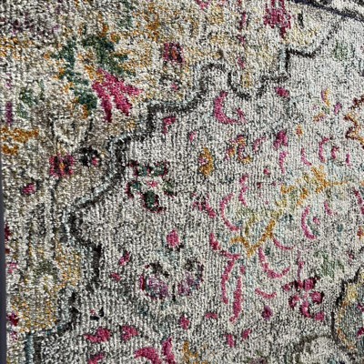The rug looks exactly like the picture and came in perfect condition. It's a beautiful pattern and comfortable to walk on, also easy to vaccum. I've gotten many compliments on it and am very pleased with my purchase.