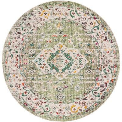 This 6'-7" X 6'-7" Round rug captures the eye with its bold and vibrant palette of green and rust tones, bringing a refreshing and sophisticated touch to any room. The round shape exudes elegance and is perfect for creating defined spaces in open floor plans or for adding a harmonious accent in smaller rooms.