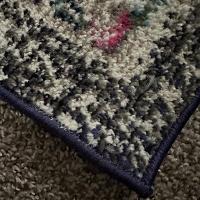 It is a great rug! However it is not black and gold like described. The trim stitch is definitely a royal navy blue and very prominent in the sunlight. The Actual dark on the carpet is a purple hue. The carpet is great quality otherwise