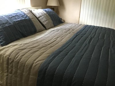[This review was collected as part of a promotion.] This Madison Park 3-piece Coverlet/quilt set, includes the King/California King size Quilt and two matching king size pillow shams. The set is done in pretty, relaxing hues of blues and grays. This quilt has a nice binding on the edge and a simple Pretty stitching through out the quilt. It appears to be very well made with quality materials. I’m very pleased with this bedding set.