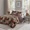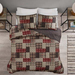 Rich in color, the Madison Park Hilltop 3 Piece Reversible Printed Quilt Set offers a lodge style update for your bedroom. This reversible rustic quilt features a patchwork print, in red and black hues, for a cabin-inspired look. The reverse showcases a clean and inviting all-over windowpane print to complement the top of the quilt. Zipper closures on the 2 matching reversible shams create a clean finished edge, while cotton-rich filling and channel quilting provides a soft hand feel. Machine washable for easy care, this reversible quilt set brings a warm cabin look to your bedroom decor.