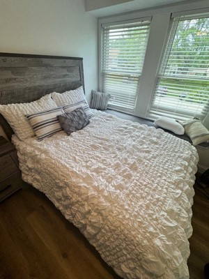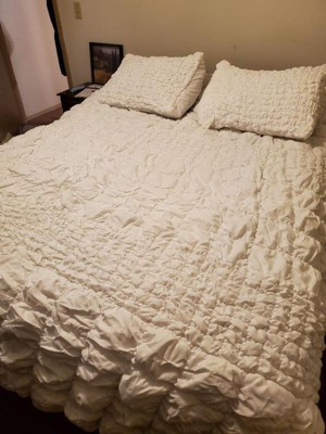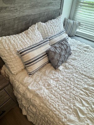 This Madison Park Josie shabby chic cottage style comforter set features elastic embroidery creating both small and large square shaped ruching, giving the bedding set a stylish puffy appearance. Also included are two matching shams featuring small ruching to complete the look. Available in multiple colors: soft white and warm grey.
