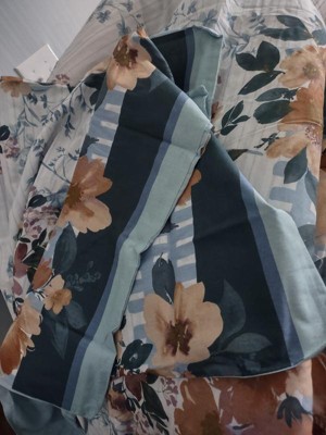 This Madison Park shabby chic cotton comforter set features a floral print design on top of light grey vertical stripes with additional teal colored borders and blue lines on the edges. Two decorative pillows with pleated and embroidery floral add a touch of elegance and refinement. The cotton face and poly/cotton reverse will ensure a soft and comfortable sleeping experience.