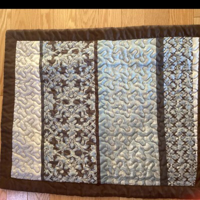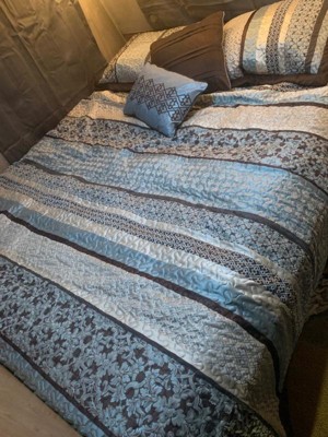 [This review was collected as part of a promotion.] This set cam with 2 decorative pillows; 2 pillow shams and 1 queen sized quilt. At first glance, it appeared that the material was thin and delicate... like many sets I've had before that fell apart at the seams. This IS NOT like those sets. The fabric is a better quality. More on the side of upholstery fabric but still soft and thin enough for a beautiful quilt. The embroidery is very pleasing. The blanket has a heavy feel to it without being too weighted. It literally felt like I was being hugged once I was under it. The decorative pillows are beautiful and offer a different style on the front and back of the pillows. The shams match the quilt and add that extra touch to the set. The colors vary in different light settings. There is dark brown throughout the front and solid across the back of the quilt and shams. The blue goes from looking blue to appearing gray in different light. All in all, this is a wonderful set that I can tell will last a long time. Very well made.