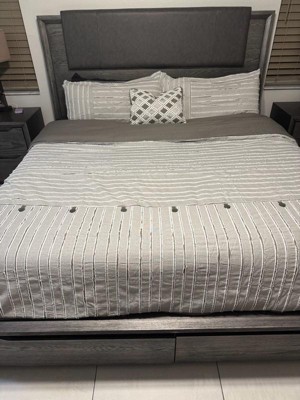 A: Our rustic-style comforter set showcases a two-tone blend of light grey, which is a soft and subtle shade that falls within the pale spectrum of grey tones, and dark grey, a shade within the grey color spectrum that is characterized by being deeper and richer than lighter greys, accentuated by white details. Please keep in mind the lighting in product photos can affect the way the color appears. Additionally, some fabrics can have a slightly different shade depending on the angle at which they are viewed.