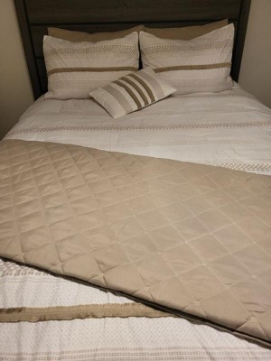 [This review was collected as part of a promotion.] Beautiful neutral cream and taupe 7 piece comforter. It's a great set for all seasons. The quilt is large, thin, and lightweight. The shams are the perfect size to make the pillows look full. The quality could be better, though - there were a couple of tears and miss aligned seams. Overall, it's a beautiful set.
