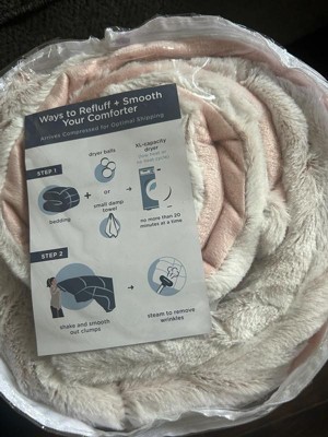 [This review was collected as part of a promotion.] Exquisitely comforting in softness. While this set is noted as faux fur, it certainly looks and feels to be genuine. Complete with comforter and shams to match. The comforter faux fur looks a blend of white and blush color and the underneath is a light pink. The fit upon my queen bed is perfection. Although lightweight, it provides plenty warmth for a chilly night. After an initial cleaning in my home washing machine the comforter and shams remained in tact with no piling or breakdown, the lint was minimal in the dryer and it does not shed, which signifies a good, quality product. This set is nothing short of luxurious, plush, gorgeous - I absolutely love this set.