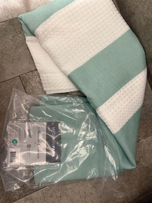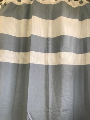 Update your space with the Spa Waffle Shower Curtain with 3M Treatment. Featuring a fresh and updated stripe design, this shower curtain is made of a light heathered colored fabric pieced with a white waffle weave base creating a beautiful texture for the perfect spa touch to your decor. A temporary 3M Scotchgard water repellent treatment keeps your curtain looking newer, longer and is active for multiple washes. A waterproof liner is not included but still highly recommended to keep this shower curtain in its best condition; Hooks and Rod also not included and should be purchased separately. Various colors and sizes are available to fit any bathroom space. Size shown in image is standard 72x72", stripe design may vary per all other sizes. Complete the collection with coordinate Spa Waffle Bath Towel and Spa Cotton Bath Rug, available and sold separately.