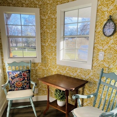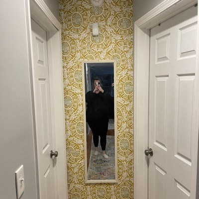 A: The wallpaper is primarily a vibrant yellow with white medallion patterns and darker yellow accents.