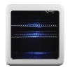 The Magic Chef 1.7-Cu. Ft. Retro Beverage Cooler in White will be the ideal addition to any dorm, office, or rec room. The stylish nostalgic look will complement any decor. The LED blue lighting showcases your beverages. The tinted double-pane glass door is more energy efficient than single-pane glass and helps prevent condensation. There are 2 removable wire shelves which can be adjusted according to your beverages. The beverage cooler offers a 1-year parts-and-labor warranty and 5-year compressor-part warranty._