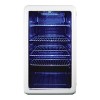 The Magic Chef 3.4-Cu. Ft. Retro Beverage Cooler in White will be the ideal addition to any dorm, office, or rec room. The stylish nostalgic look will complement any decor. The LED blue lighting showcases your beverages while the tinted double-pane glass door is more energy efficient than single-pane glass and helps prevent condensation. There are 4 removable wire shelves which can be adjusted according to your beverages. This beverage cooler offers a 1-year parts-and-labor warranty and 5-year compressor-part warranty._