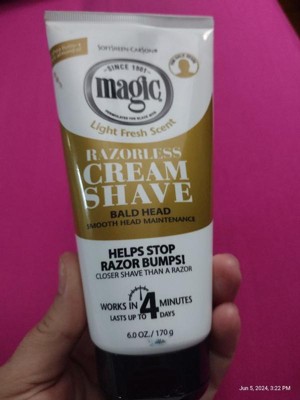 [This review was collected as part of a promotion.] SoftSheen-Carson Magic Razorless Cream Shave is a shaving cream that is formulated to help stop razor bumps and give a closer shave than a razor. It works in four minutes and lasts for four days. Pros Specifically formulated for stubborn hair and bumps Able to be used on your face, legs and heads for bald people Works quickly Cons May not be suitable for sensitive skin Unpleasant scent
