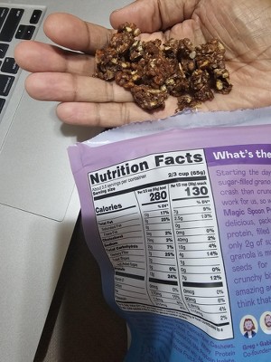 Who says you can’t have chocolate for breakfast? Magic Spoon Protein Granola is delicious, packed with 13g of complete protein, filled with 7g of fiber, and has only 2g of sugar per serving. Our granola is made with real nuts and seeds for a satisfyingly crispy, crunchy bite. Granola that tastes amazing and powers your day? We think that’s pretty magical. Enjoy it as a snack on its own, or with your favorite milk or yogurt!