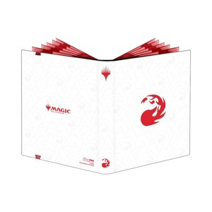 This 9-Pocket PRO-Binder for Magic: The Gathering features a white leatherette material with the iconic red Mountain symbol and matching red elastic strap. Store and protect up to 360 standard size trading cards double-sleeved in Ultra PRO Deck Protector® sleeves. Each pocket page is backed with a low-friction, red material to give cards a classic, framed look. Side-loading pockets and low-friction material help keep cards in place. All materials are archival-safe, acid-free, and non-PVC for premium protection.