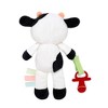- 8-inch cow plush paci-buddy has a strap for securing baby’s pacifier