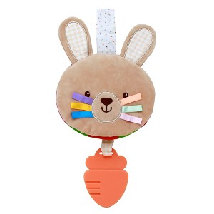 - Plush book features a 3-D bunny face on the cover with interactive satin ribbons
