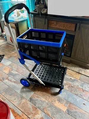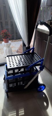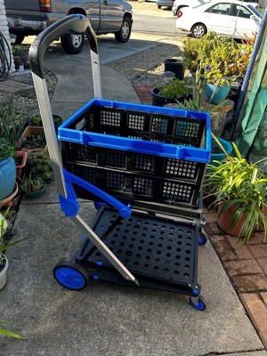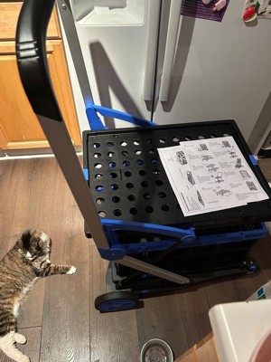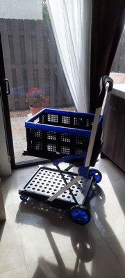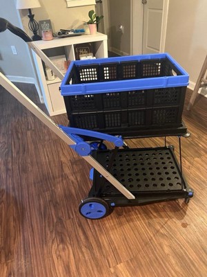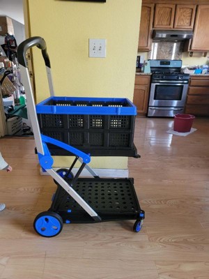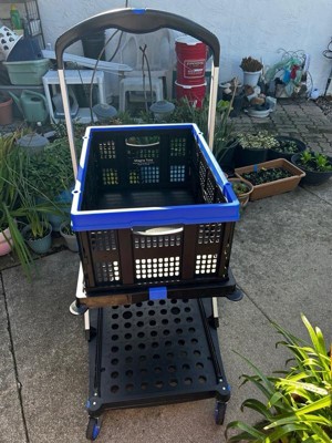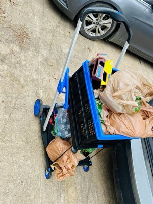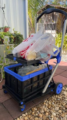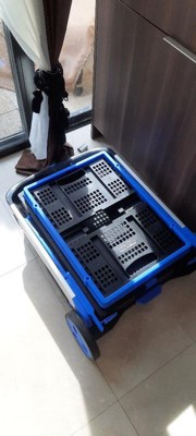 [This review was collected as part of a promotion.] I received this card in exchange for honest review. First of all start saying that I have hand troubles and joint issues in my upper body, so needing some thing that rolls around to transport groceries from the car to the house is needed. The cart was very easy to assemble, and it's very easy to set up to use it folds down nicely. The top portion is a crate that lives onto a flat pad and their support polls that come up from the base to support that that construction was clever and helps when you have more weight up top it's also nice that the crate you can lift it out away from the cart and carry it somewhere else. The larger wheels is nice as it goes over cracks and bumps and things like garden hoses and stuff like that. The cart is extremely light and white, which is a complete bonus but it's also unfortunately a negative. The construction of the cart I'm not sure how much where in Terrance going to take I do know something like this would not last with my dad or any email I have ever known. Men tend to be rough and I don't think this can truly take dropping things on it and the wear and tear that a man would probably put it through. I use it for like I said groceries I'm not sure I put the case of water on the bottom, not the top because I didn't want to break it. I guess my feedback would be is to try to make more parts metal so it could accommodate more. I hate to save abuse, but that's kind of the word I'm looking for. I like the cart and I am thankful to have received it to try. I would consider buying this if I would not given one but I'd wanna know these things before and I'd probably want to try it to see how well it would work for my uses my income is extremely limited, and, it's a little on the steeper side for somebody at such as myself to afford. Great item and features just for light to lower medium use