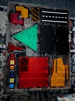- What’s Included: 50 magnetic pieces, including: 1 Crane + Base, 1 Dump Truck Tailgate + Base, 1 Plow, 2 Truck Cabs, 2 Figures, 2 Rectangle Roads, 2 Curved Roads, 2 Rectangles (Printed), 2 Car Chassis, 2 Windows, 1 XL Right Triangle, 4 XL Equilateral Triangles, 6 XL Squares, 14 Squares (4 Printed, 8 Regular) and 6 microMAGS Isosceles Triangles.