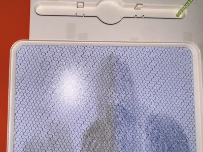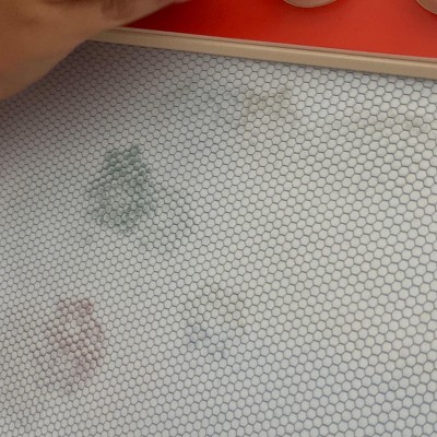 A: The drawing board includes five stamps and one tethered magnetic pen.