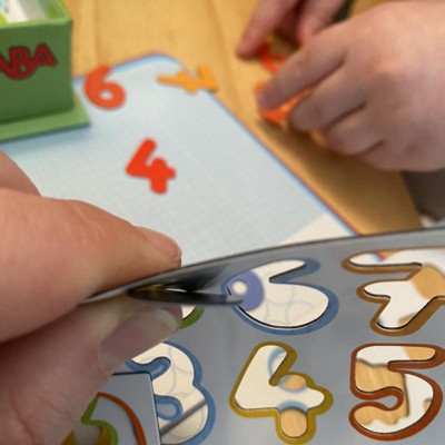 1, 2, 3 numbers & me! This cheerful number arranging game playfully introduces your child to the world of numbers and amounts. A great selection of motifs invites children to make merry with mathematics. Handy cardboard carrying case and magnetic pieces make this set ideal for travel.