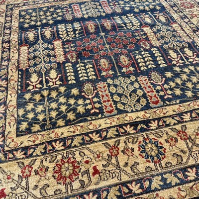 This is a beautiful, quality rug. But…the photo shows a more muted, neutral coloring. It’s actually a more vibrant blue (hence the descriptor “navy”). I took a chance on it because of the photo. It’s lovely but doesn’t fit our room. If you want navy and warm tan, it’s for you. I took photos that I hope do a better job showing the actual color.would have given 5 stars for quality if the photo hadn’t been misleading.