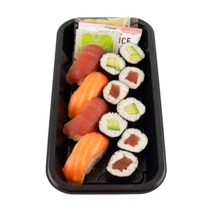 Mai Sushi's Tuna Salmon Sampler is a classic combination of nigiri sushi and regular rolls. It features raw tuna and salmon nigiri with tuna and avocado regular rolls. This sampler really lets the authentic flavors of the fish and sushi rice shine and it's perfect for when you can't decide between tuna or salmon; now you don't have to! Best enjoyed when you can sit down and savor the sushi, but it's also great for on-the-go as it comes packed in a reclosable container with a convenient built-in sauce well for dipping soy sauce and wasabi.