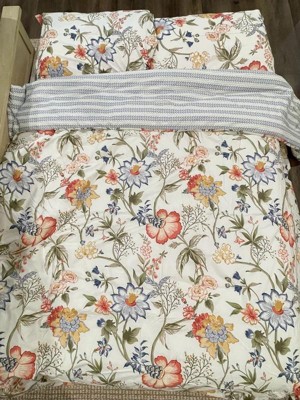 [This review was collected as part of a promotion.] I received this Levtex Home Maileen Comforter Set complimentary from Influenster in exchange for my honest review, and it’s quickly become one of my favorite bedding upgrades! Right out of the luxurious packaging (it comes in a sturdy, high-end reusable bag that feels premium), there was no chemical or off-putting smell at all — just a fresh, clean scent like new cotton should have. That was a huge relief, as some bedding arrives with that strong factory odor that lingers for days. This one was ready to use straight away. The design is gorgeous — a vibrant, detailed floral pattern with soft blues, corals, pinks, yellows, and greens on a creamy white background. It’s cheerful and elegant at the same time, and the reverse side has a subtle coordinating stripe for a different look whenever you want. The print is crisp and beautifully executed. Comfort is spot-on: the 100% cotton shell feels incredibly soft and breathable, while the polyester fill gives it nice thickness and loft. It’s cozy and warm without being too heavy, and it stays cool throughout the night — perfect for year-round use. After several weeks of regular use and a couple of washes (machine-washed on gentle, tumble dry low), I’m impressed with the durability. The colors haven’t faded at all, the stitching is holding up perfectly with no loose threads, and it still looks and feels brand new. No pilling, no shifting of the fill — everything stays evenly distributed and plush. Overall, this Maileen set combines beautiful design, luxurious feel, and solid quality. It’s comfortable, breathable, odor-free from the start, and built to last. If you’re looking for a floral comforter set that feels high-end without the hefty price tag, this one is a winner. Highly recommend!