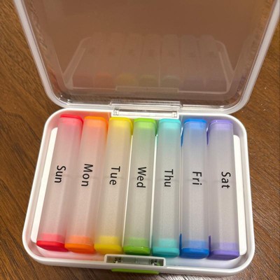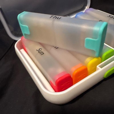 Really like the design of this, makes it easy to take with me and has helped me be more consistent in taking what meds and vitamins. The picture features it in black but I received it in white. Still it does what it needs to, just wish I had the option to choose.