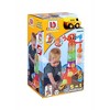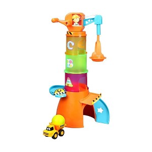 The Stacking Crane teaches children size comparison and rewards them for stacking the crane in the right order. Simply stack the pieces from biggest to smallest, and the construction foreman can load the ball and watch it roll through the translucent pieces until it drops down the slide and into the waiting Dump Truck.