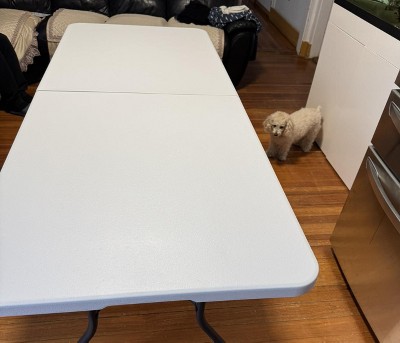 The folding table is sturdy and easy to set up. It folds and unfolds smoothly, and the handle makes it convenient to carry around. The surface is easy to clean and large enough for family gatherings or small events. It’s a bit heavier than I expected, but overall a good and practical purchase for both indoor and outdoor use.
