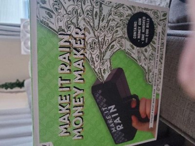 This product is a "Make It Rain Money Maker," a fun and interactive gadget designed to spray fake money in style. Perfect for parties, celebrations, or simply livening up any event, this device adds a touch of humor and flair to any gathering. With 50 fake $100 bills included, you’ll have plenty to create an unforgettable scene.
