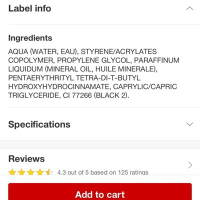 The formula for this eyeliner has apparently changed, and Target did not update their information on the listing. I have previously purchased this eyeliner, and was ordering a replacement today. I am very allergic to phenoxyethanol, as many people are, so even for cosmetics I have purchased before, I always check the ingredients list in case the formula has changed. I checked this listing before adding it to my delivery order, and I checked the ingredients again before opening the eyeliner. I was disappointed to see my allergen listed in the ingredients list. The correct ingredients list is: Aqua (water, eau), styrene/acrylates coploymer, propylene glycol, glycerol, phenoxyethanol, sodium hyaluronate, CI77266 (black 2)