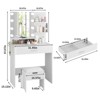 This new-design makeup table features a shelf-mounted charging station with 2 standard sockets and 2 USB ports, perfect for powering LED lights, phones, PCs, and hair dryers. It includes a large mirror with 10 dimmable LED bulbs (3 color modes) and a dedicated hair dryer rack for easy access. Measuring 31.5*15.8*57.7 inches, it offers ample storage via large drawers for cosmetics, tools, and jewelry, plus space in the soft cushioned stool. Elegant and sturdy, it enhances bedrooms, comes with step-by-step instructions, and makes a lovely gift for loved ones.
