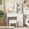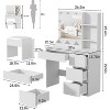 - [Ample Storage Space] This thoughtfully sized vanity mirror with lights and table set (31.5”(L)*15.8”(W)*57.7”(H)) offers ample storage. With spacious drawers, three shelves, and an extra cushioned stool, you'll have enough room for all your makeup essentials, hair tools, jewelry, and lotions. Keep your desktop organized and clutter-free.