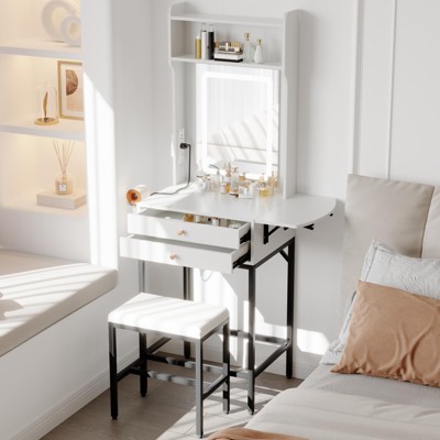 Makeup Vanity Desk Set with Mirror, Mini Makeup Table with 2 Drawers, Dressing Table Hair Dryer Holder, Vanity Table with Fold-Up Panel, for Bedrooms