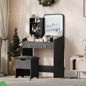 - Vanity with Storage: This vanity desk with mirror and lights features a spacious tabletop, 1 open shelf, and 2 drawers, providing ample space for your beauty essentials. The hidden storage inside the stool keeps your personal items discreetly organized. Perfect for small spaces!